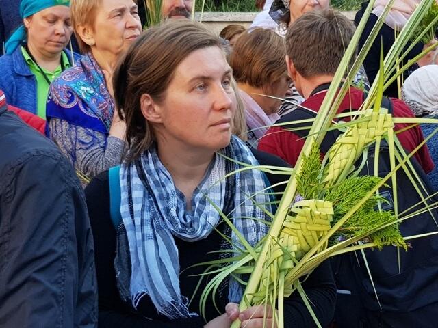 המאמינים מתקבצים במתחם הכנסייה ומבקרים בתוכה. כל מאמין נושא כף תמרים המעוטרים בצלבים קטנים הקלועים אף הם מכפות תמרים.