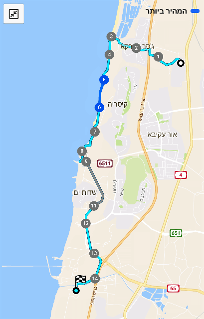 המסלול מתחיל במושב בית חנניה ומסומן במקביל לאמה הגבוהה. בהמשך עובר בכפר ג'סר אזארקה ומגיע למפרץ המדהים של הכפר. ההליכה לאורך קו החוף המפורץ, ועד לחוף האמה – האקודוקט. מנקודה זו עוזב השביל את קו החוף וממשיך בתוך רצועות החול לעבר העיר העתיקה קיסריה.
