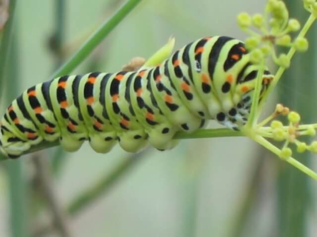 עם בקיעתם הם שעירים ושחורים ואורכם מילימטרים ספורים. בשיא גדלם הם מגיעים לאורך 5 ס"מ, ורחבם קטן מעט מסנטימטר. בתחילה הם מעוטרים בשחור וכתום ובמהלך כחודשיים הופכים ירוקים עם פסי רוחב אליפטיים המשמרים את הקוד שחור כתום – צבעי אזהרה והפעם לא בכדי.